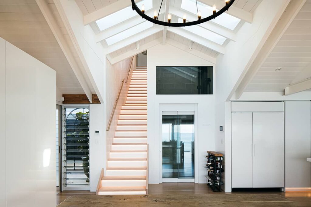 The current home is situated low on the block, with steep stair access down from the garage at street level. By removing the existing double garage on street level, we were able to provide space for the new entryway, lift, staircase & 3 bedroom extension including a double garage. An internal lift and a new staircase were incorporated, to link the original home together and provide easy access. In the new dwelling construction, structural steel was laid to support a suspended concrete slab, which helped create a lightweight construction and reduce foundation costs. This also provided the client with good thermal properties for heating and cooler in summer and winter months.