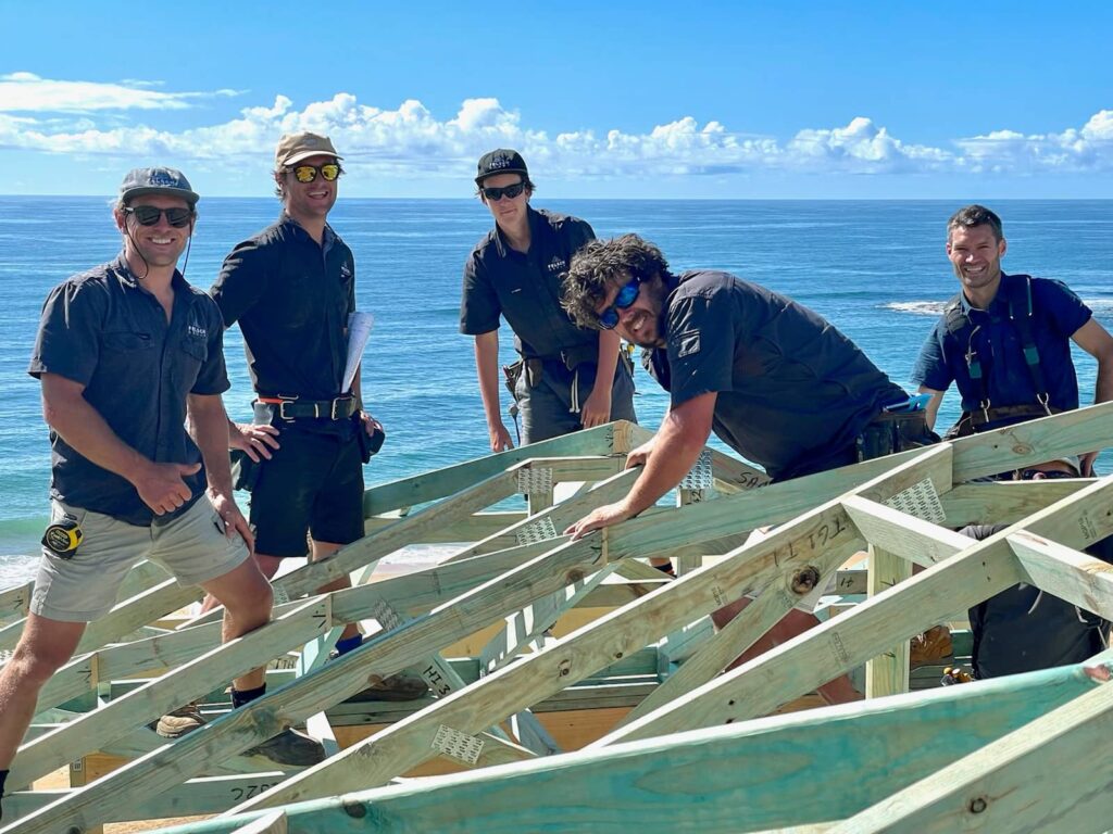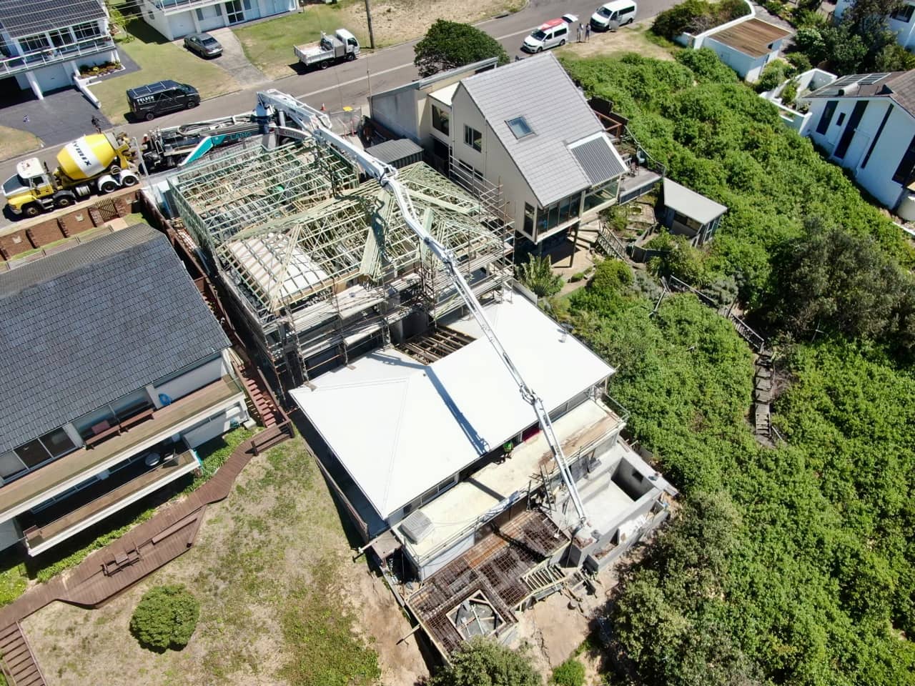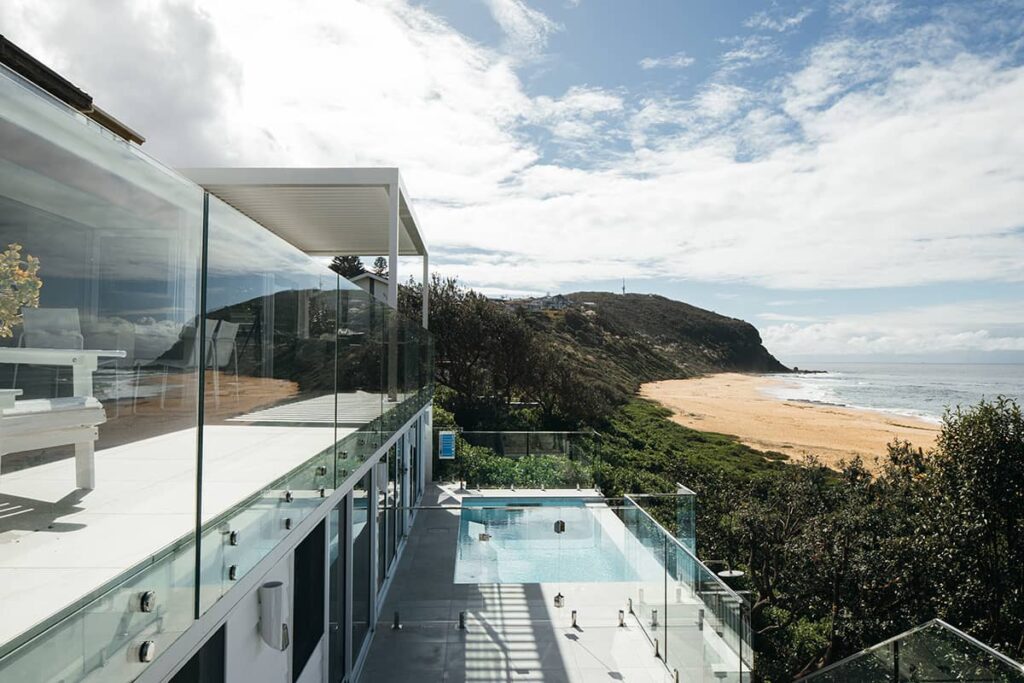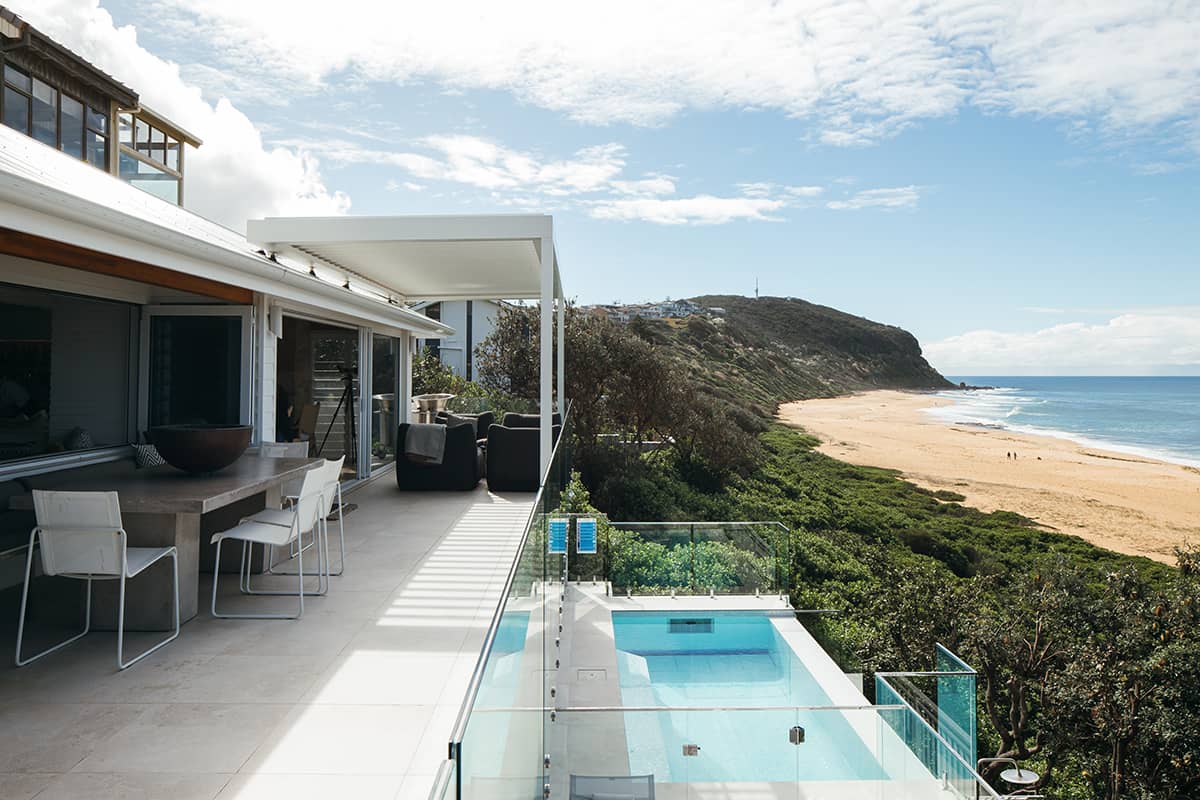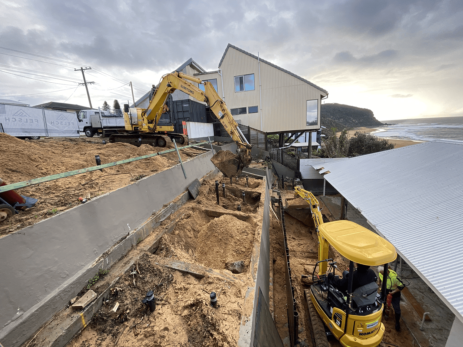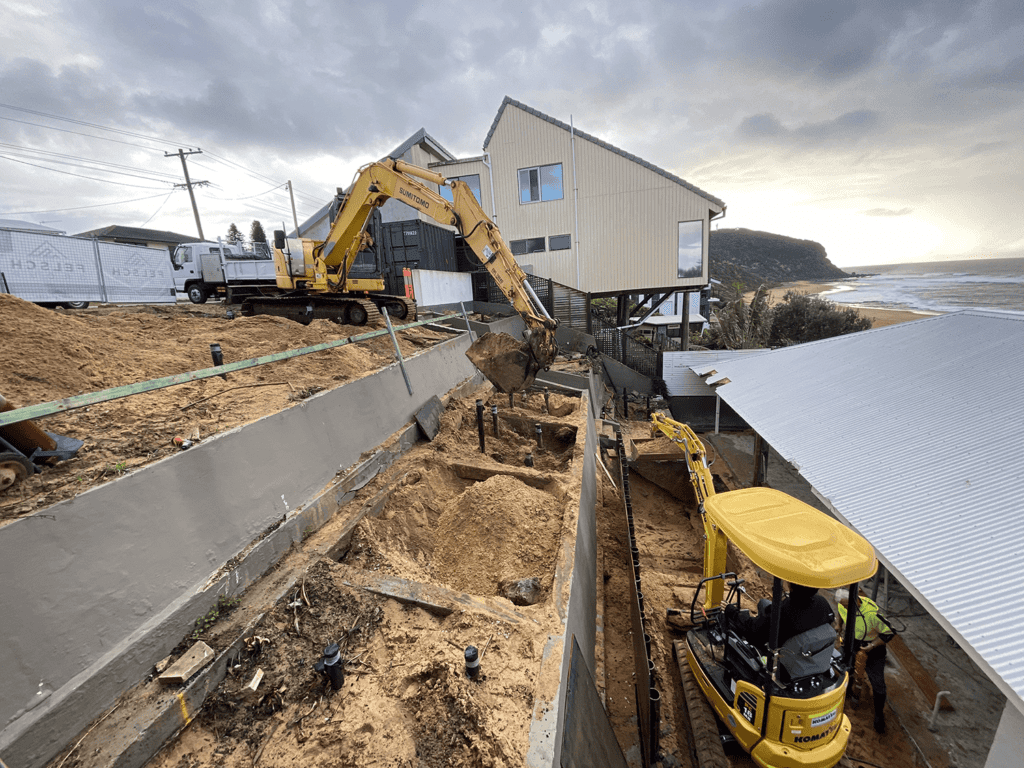 There was a considerable amount of planning and engineering involved, alongside working with the coastal erosion team and local council due to the steepness of the site and sandy foundations. A pool was also designed and built within the erosion zone, creating many environmental challenges in itself. A 250 tonne crane was needed to lift a 6 tonne excavator down the hill in order to drill foundations for the pool, as there was no access from the street or the beach. Large cranes were frequently used throughout the construction phase to lift in and lift out materials and building wastes throughout the project due to limited site access and the weight of materials.