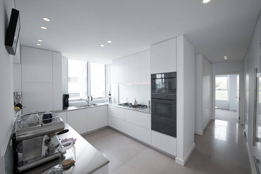 The renovation was a complete interior fit-out, including; soundproofing, heated flooring throughout, marble tile floors to main areas and, all new electrical, bathrooms and joinery. Abseilers were also used to install new full-height glass windows to the unique curved facade of the unit.